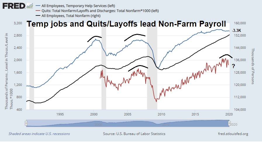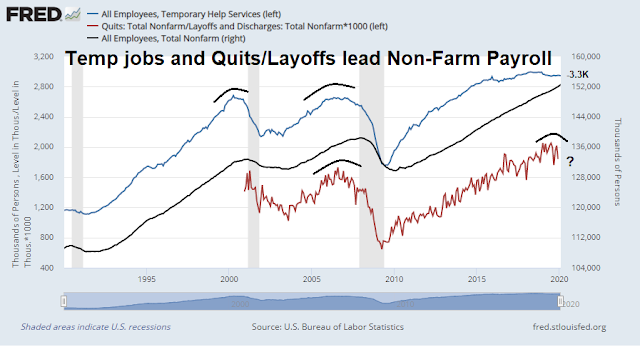 In addition, some cracks are appearing in the labor market. Despite the blow-out Jobs Report, leading indicators such as temporary employment, and the quits to layoffs rate (which will be updated next week in the JOLTS report), are exhibiting signs of weakness. These troublesome signs are showing up during a period that pre-dates any effects of the COVID-19 outbreak in the US. What happens in March, when the full effects of the coronavirus slowdown hit the economy?
