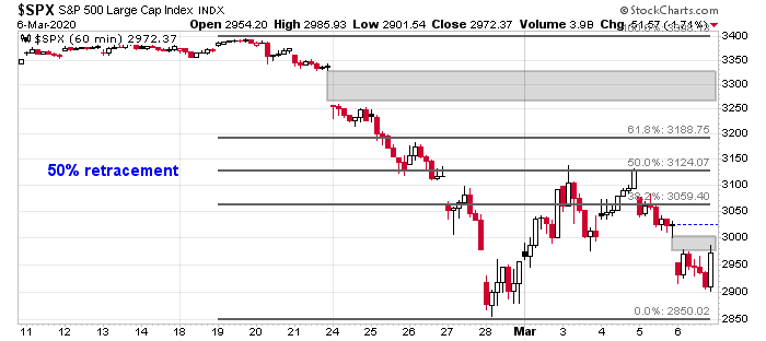 The hourly S&P 500 chart provides some guides to rally targets. At a minimum, the gap at 3000 should be filled. The 50% retracement level of 3124 had acted at resistance in the past, and the bulls will find it to be a formidable obstacle. Above 3124 is the gap at 3260-3330 that needs to be filled, followed by a test of the old highs. I am not holding my breath for an advance beyond the 50% retracement level.