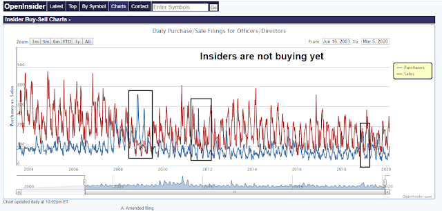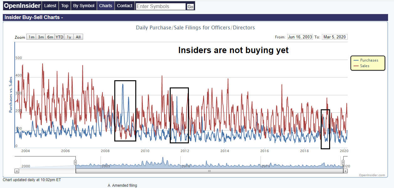 If a bear market has indeed begun, one sign of a bottom is insider buying. There were clusters of insider buying during 2008, 2011, and in late 2018. There is no such signs today.