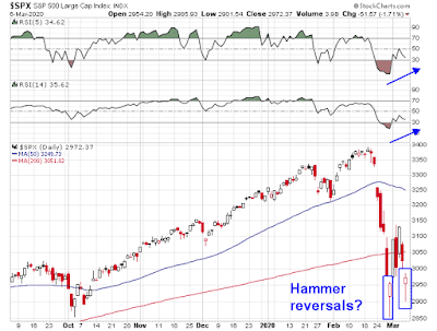 The two hammer reversals are as classic as they get, no question about it (as far as short term trades go). That said, VIX needs to come down, breadth needs to broaden, insiders need to start buying, bad news on the Corona virus needs to go to page six not page one, for a more comfortable buy zone.
