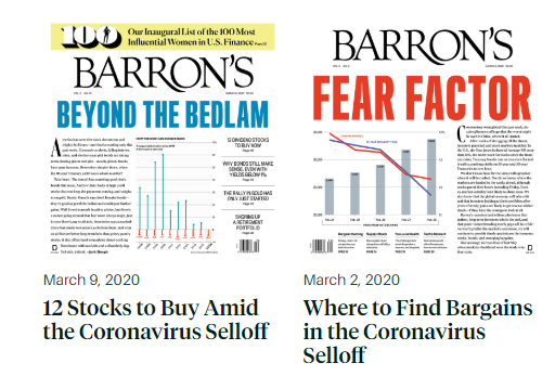 My personal assessment is we hit unbridled panic last week, based on the comments on my social media feed. Consider how the tone of Barron’s covers have changed in a few short weeks, as a classic example of the contrarian magazine cover sentiment indicator. A few weeks ago, Barron’s was constructive in the face of the market weakness.