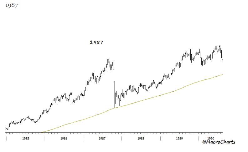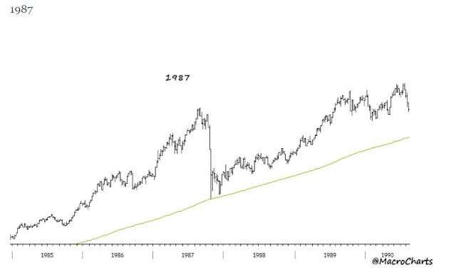 The crash of 1987 saw the market bounce, followed by a re-test within a few weeks. The market continued to advance after that event as the market crash did not spark a recession.