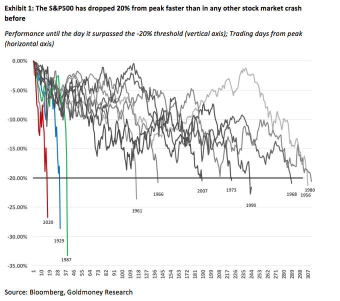 This retreat into bear market territory, as defined by a -20% decline, was the fastest in market history, even compared to the Crashes of 1987 and 1929. Bear in mind that if this was the capitulation low, the market bounced at the initial low in 1929, and in 1987. Each had very different results. Both were market crashes, one went on to mark the start of the Great Depression, the other was just a blip in a continuing economic expansion.
