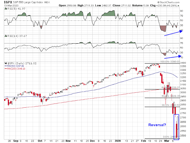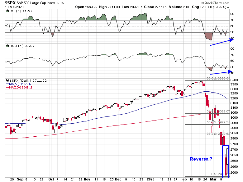 Is this the long await bounce for the stock market? The SPX traced out a strong bullish reaction to Thursday’s ugly action while exhibiting positive RSI divergence. If this is the long awaited bounce, the most logical resistance level is the 50% retracement, which is also the site of the 200 day moving average.