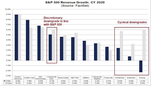 A more detailed analysis of sales estimates tells the story. The softness in estimates is concentrated in the cyclical part of the market, industrials, energy and materials, which is reflective of the weakness emanating from China and oil price war. Consumer discretionary sales downgrades are only in line with the market. The discretionary stocks are likely to be most affected by the demand shock that hits the economy as the COVID-19 epidemic spreads in the US. In short, EPS downgrades have a lot further to go because they have not fully reflective of the damage from the coronavirus epidemic.