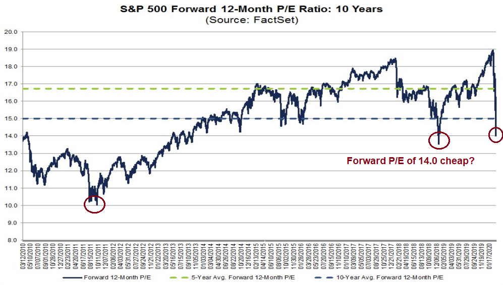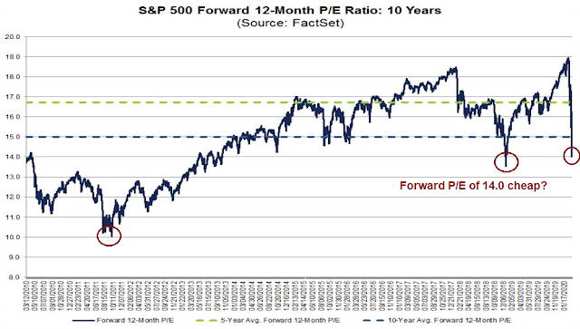 Here is the bull case. FactSet reported that the market’s forward P/E ratio fell to 14.0, which is below the 5-year average of 16.7, and 10-year average of 15.0. A 14x multiple is close to the multiple achieved at the Christmas Eve bottom of 2018.