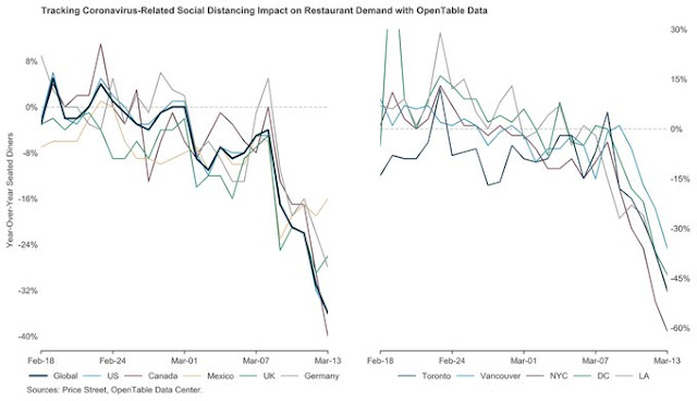 What caught my eye was the comment, “This is a fear-based event more akin to 9/11 than 2009”. Indeed, Open Table restaurant bookings are down -36% year over year globally, -36% in the US, -40% in Canada, -61% in New York, and -49% in Toronto.