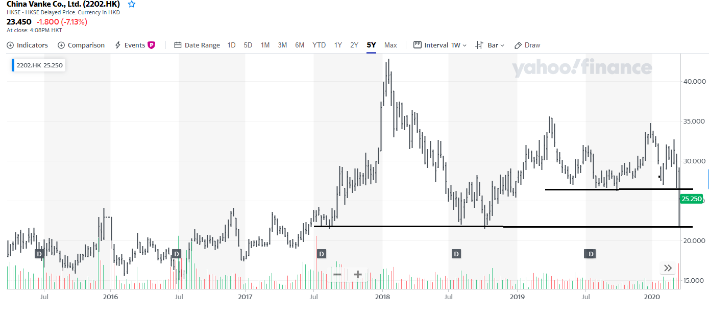 The charts of other property developers appear serious, but less dire. China Vanke fell -7% overnight, breached short-term support, and it is now testing long-term support.