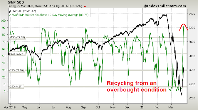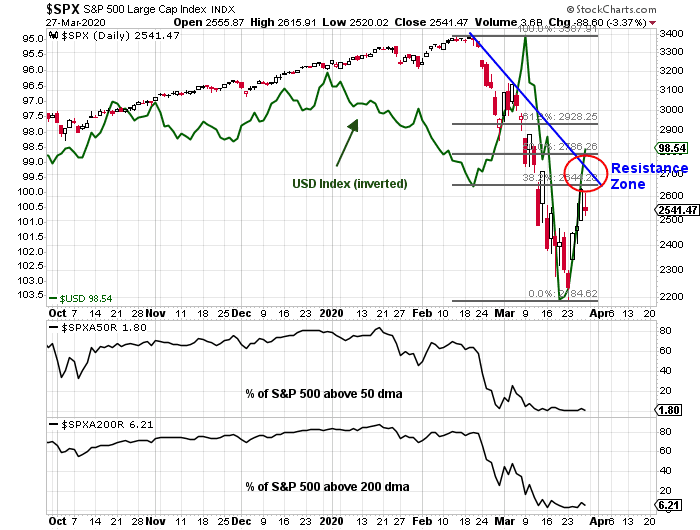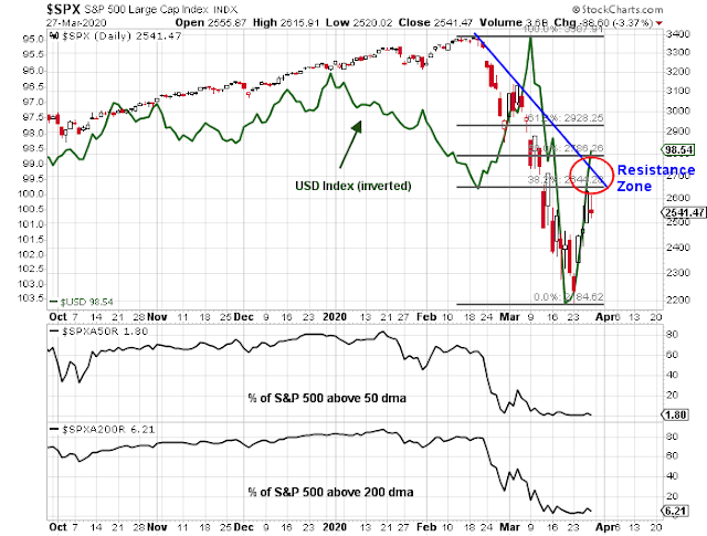 As well, any declaration of a new bull market has to tempered by the observation that the percentage of stocks above their 50 day moving average is only 1.8%, and above their 200 dma is 6.2%. Arguably, equity market strength could be explained by Fed action to establish dollar swap lines. The initiative sparked a decline in the USD which alleviated a lot of the tensions in the offshore dollar funding market.