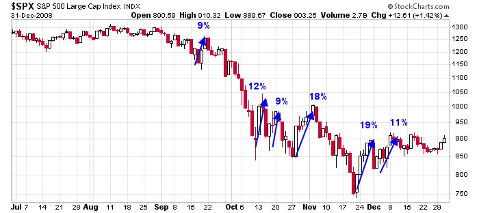 If last week’s market volatility was last found during the time of the Great Depression, it is difficult to believe that we have suddenly exited the shortest bear market in history. Daily index price swings of 3% and 5% simply do not occur in bull markets. This kind of market action is the signpost of a bear market. The 2008 bear market experienced numerous brief and sharp rallies of between 9% and 19% within the space of four months.