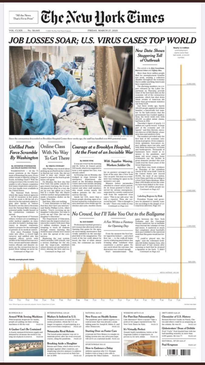 So far, the market hasn’t shown much reaction to macro developments. Nevertheless, the major highlight last week in top-down macro data was initial jobless claims. The chart from the from page of the New York Times is certainly a front page for the history books. Wow!