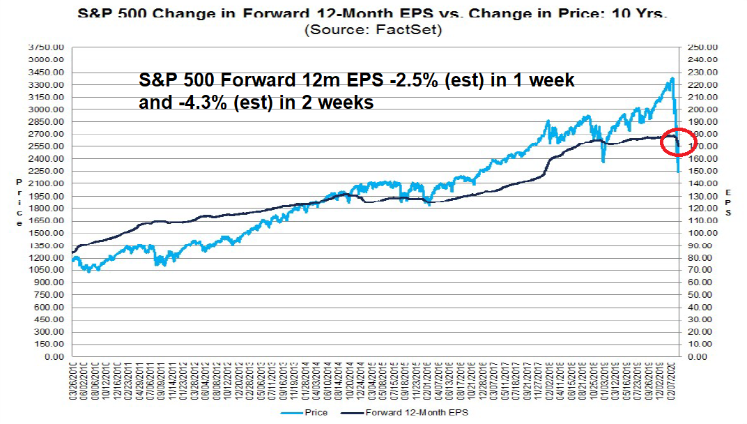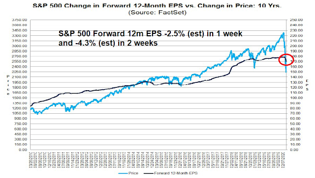 The rise in the forward P/E ratio is attributable to a combination of rising prices and falling forward earnings. Wall Street analysts have finally begun to downgrade EPS estimates, and forward earnings skidded -2.5% in 1 week and a cumulative -4.3% in two weeks.