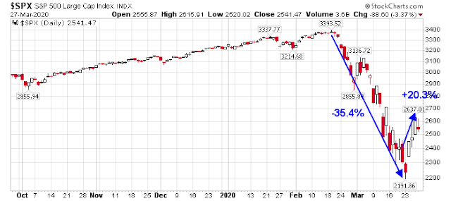A week ago, I was impatiently waiting for a bear market relief rally (see This is insane! Where’s the bear market rally?). The market gods heard my pleas, and the market surged 20.3% from intraday trough to peak last week, which is enough to pass the definition of a new bull market.