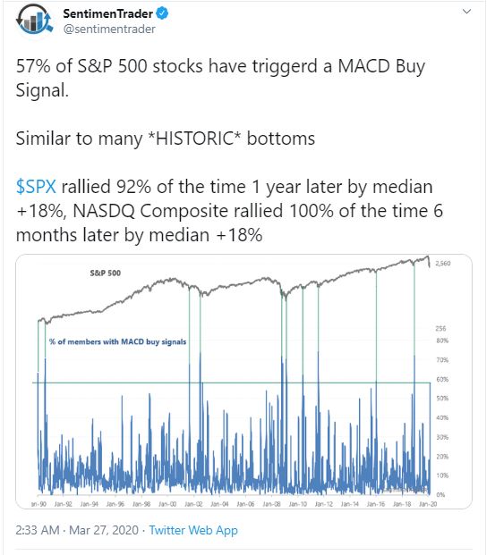 Similarly, SentimenTrader observed that 57% of the S&P 500 have triggered a MACD buy signal, which is a bullish price momentum signal. The key caveat to that buy signal is that it has occurred during bear market rallies in the past. While the market may have been higher in a year’s time, the shorter term outlook may not necessarily be as bullish.