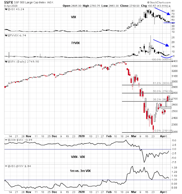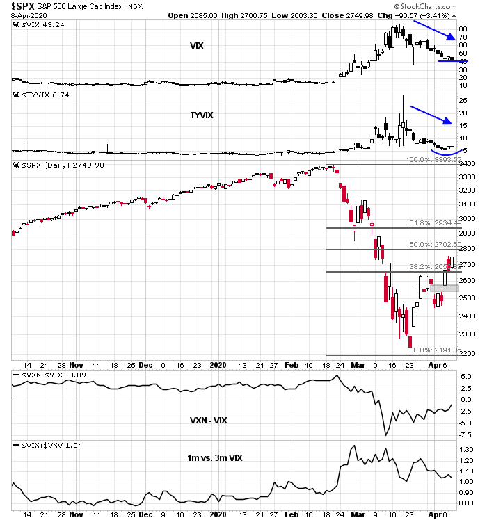 The bears can argue that both VIX and TYVIX seem to be finding a floor. Moreover, the term structure of the VIX (bottom panel) remains inverted, indicating elevated fear levels.