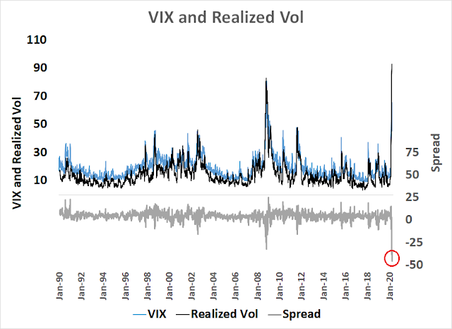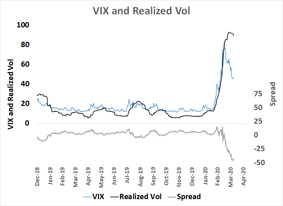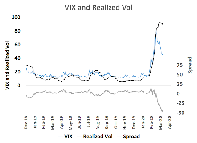 Here is a close-up look. Both realized and implied volatility are rolling over, but implied volatility (VIX) is falling faster than historic realized volatility.
