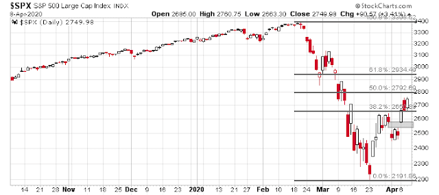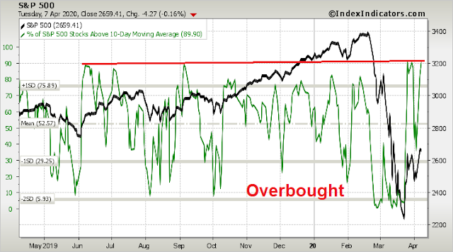 From a tactical perspective, here are a couple of reasons why you shouldn’t press your long bets, even if your are bullish. First, Alex Barrow at Macro Ops compiled a list of past bear market rallies and found that “median bear market rally lasted 35 days and rose 19%”. The latest rally lasted 12 days (as of yesterday’s close) and the market is up 25%. While there is wide dispersion in the historical results, this study study suggests that the current bear market rally is living on borrowed time.