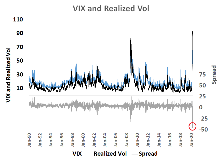 The current environment can be characterized as a normalization from blind panic. This chart of the spread between the VIX Index and realized 30-day volatility tells the story. In normal times, VIX trades at a slight premium to realized vol, but we are now seeing an off-the-charts spread between the two. The last episode of such a large spread occurred during the bear market of 2008, when market fear levels receded after the initial shock of the crisis.