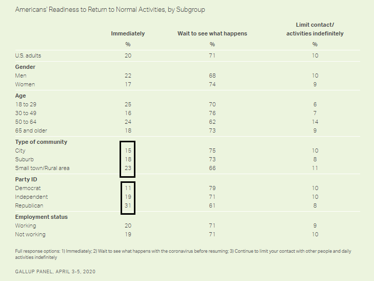Attitudes were most divided among the urban-rural axis, and by party identification. Still, only 23% of rural residents and 31% of Republicans were willing to return to normal immediately. These figures represent significant minorities of the population.