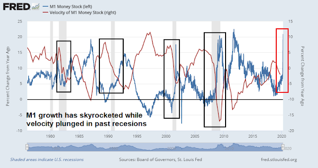 Remember the monetary equation, GDP = MV, where GDP growth is a function of money supply growth and monetary velocity. During past recessionary periods, the Fed has engaged in monetary stimulus, which boosted M1 growth (blue line), but monetary velocity (red line) fell. Will 2020 be any different?
