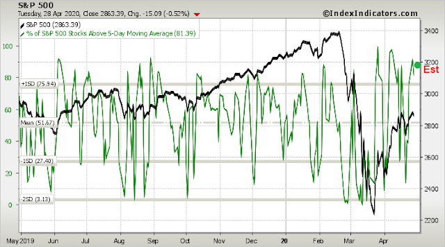 Subscribers received an email alert yesterday indicating that my inner trader had covered his short position. While the trading model had timed the sell-off and initial rebound well, it badly missed the magnitude of this latest rally. My inner trader is temporarily staying on the sidelines in cash in order to re-evaluate the technical picture. If my intermediate term assessment of a second bout of market weakness is correct, there will be plenty of opportunity to re-enter a short position. However, we need the advance to exhaust itself first, and then to assess whether the most likely path is a period of sideways and choppy consolidation, or another panic sell-off to re-test the March lows.