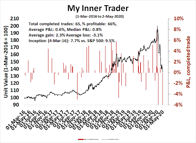 My inner trader uses a trading model, which is a blend of price momentum (is the Trend Model becoming more bullish, or bearish?) and overbought/oversold extremes (don’t buy if the trend is overbought, and vice versa). Subscribers receive real-time alerts of model changes, and a hypothetical trading record of the those email alerts are updated weekly here. The hypothetical trading record of the trading model of the real-time alerts that began in March 2016 is shown below.