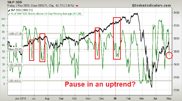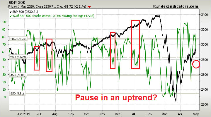 My inner trader covered his short positions last week for risk control reasons. He must have displeased the market gods, because stock prices fell sooner afterwards. Despite the late week market weakness, he is still waiting for signs of clarity on short-term market direction.