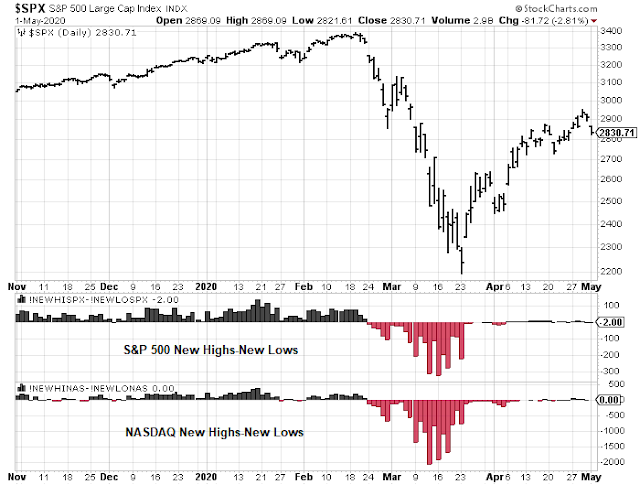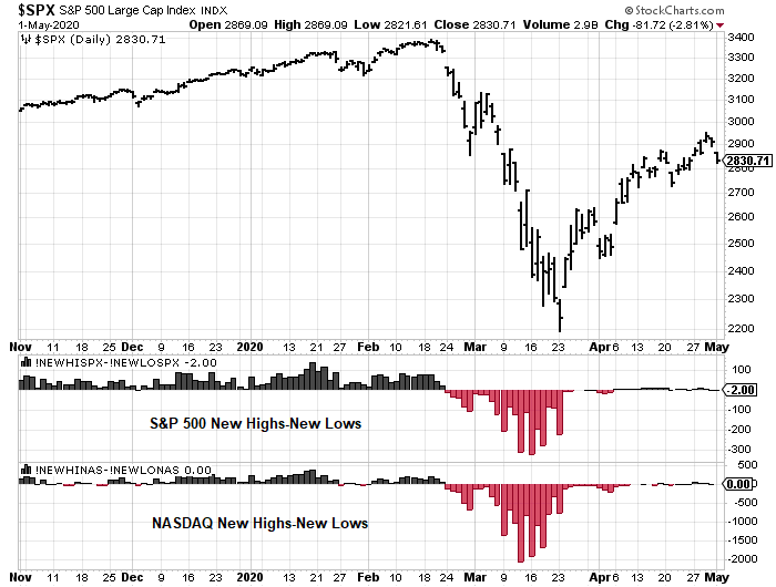 As well, new highs – new lows readings are dead neutral, indicating little momentum.