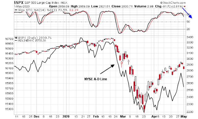Here is the bear case. The market is exhibiting signs of bullish exhaustion, as evidenced by a possible stochastic recycle from overbought to neutral territory, which is a sell signal. As well, the NYSE Advance-Decline Line has been lagging the market, which is a negative divergence.