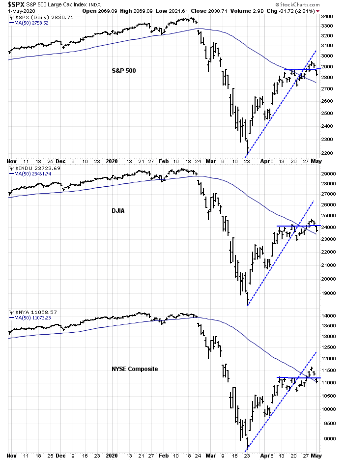 Looking to the week ahead, the recent market action presents a mixed picture. The SPX, DJIA, and NYSE Composite all broke above their 50 day moving averages (dma), which are positives. But they remain under the broken rising trend lines, which are signs that the bulls have lost control of the tape.