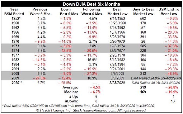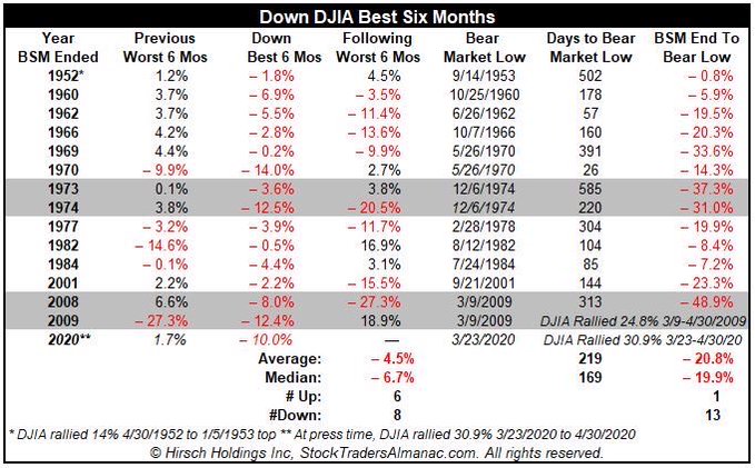 As well, we are entering the “Sell in May” period of negative six month seasonality. Jeff Hirsch at Trader’s Almanac showed what happens when the DJIA can’t even rally in the past “best six months” of the year. The following six months tend to resolve themselves bearishly.