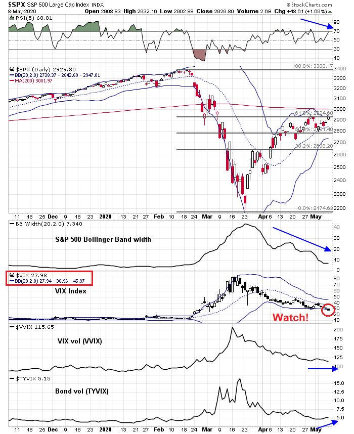 - Realized and implied volatility are falling, as measured by the falling Bollinger Band (BB) width and VIX Index.