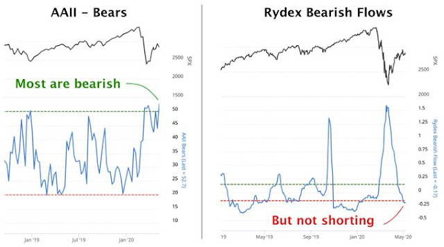 The AAII survey sample is composed mainly of retail short-term traders. If these traders are so bearish, the bearishness is not showing up in Rydex bear fund activity.