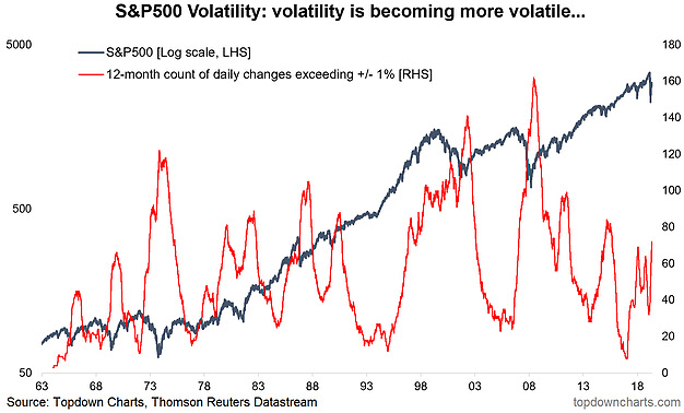 While I have no idea of the exact timing, but the market is setting up for the return of greater volatility. Callum Thomas at Topdown Charts observed that volatility is becoming more volatile. This doesn’t mean that volatility just rises, but it becomes choppier – and so will stock prices.