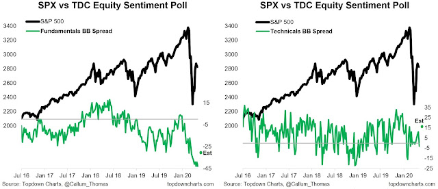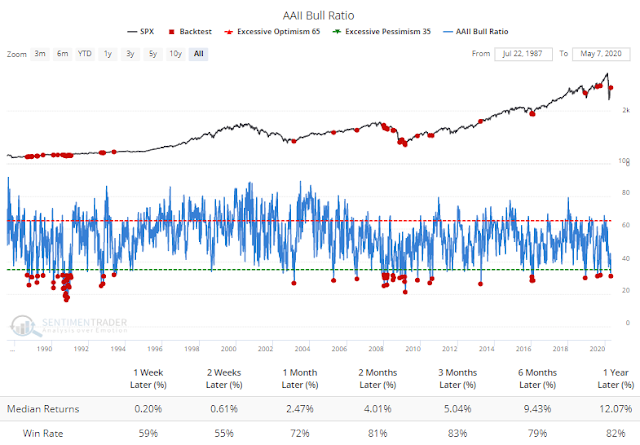 Jason Goepfert at SentimenTrader highlighted how the latest American Association of Individual Investors (AAII) weekly sentiment survey, which showed that bearish sentiment had spiked despite the stock market rally. Readings have become sufficiently net bearish that subsequent returns are bullish.