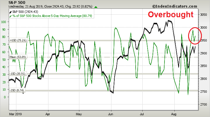 Market breadth is overbought on a 1-2 day horizon, based on the percentage of stocks above their 5 dma.