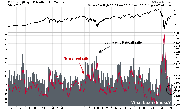 The equity-only put/call ratio is a bit on the low side. This is an indication of mild bullishness, and nearing a crowded long condition.