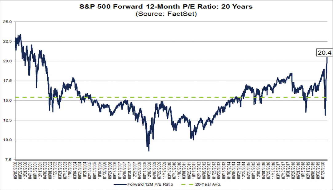 In the meantime, valuations are still challenging. FactSet reported that the market is trading at a forward P/E ratio of 20.4. The last time the market traded at these levels was in 2002, when it deflated from the dot-com bubble.