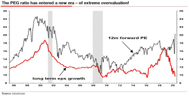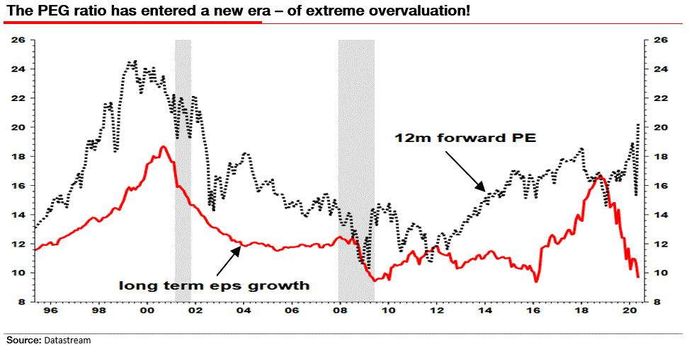 Much depends on the relationship between valuation and expected growth. I hate to quote the perennially bearish Albert Edwards, but he has a point about the PEG, or P/E to Growth ratio, as reported by Marketwatch: