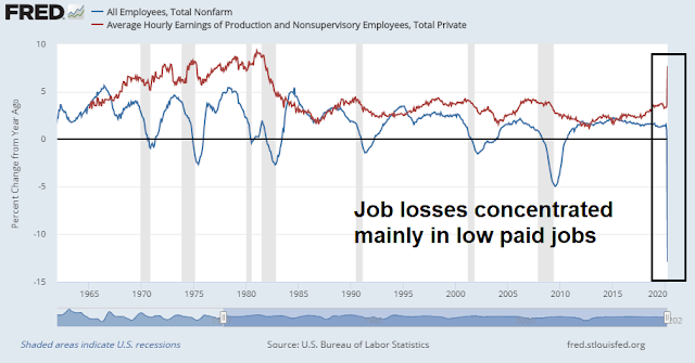 We have all heard about the joke that it’s a recession when your neighbor loses his job, and it’s a depression when you lose your job. This was starkly illustrated by the April Jobs Report. Non-farm payroll fell by -20.5 million. Lost in the initial shock of the report was the surge in average hourly earnings, which can be explained by the concentration of job losses in lower paid workers.