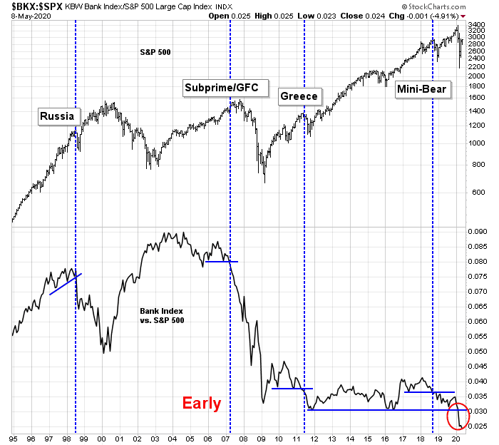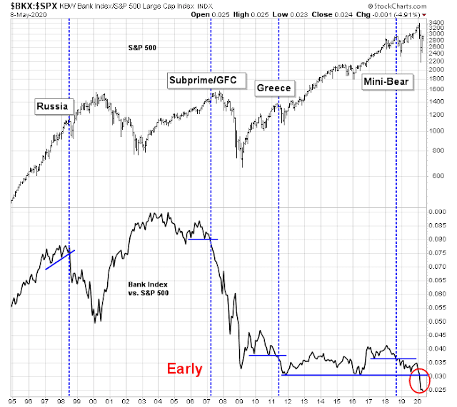 The relative performance of bank stocks is already anticipating a wave of financial distress. So far, the market has been held up by the perception of Fed’s support, but the Fed cannot supply equity to companies that have gone bankrupt. Will this cycle be any different from past cycles?