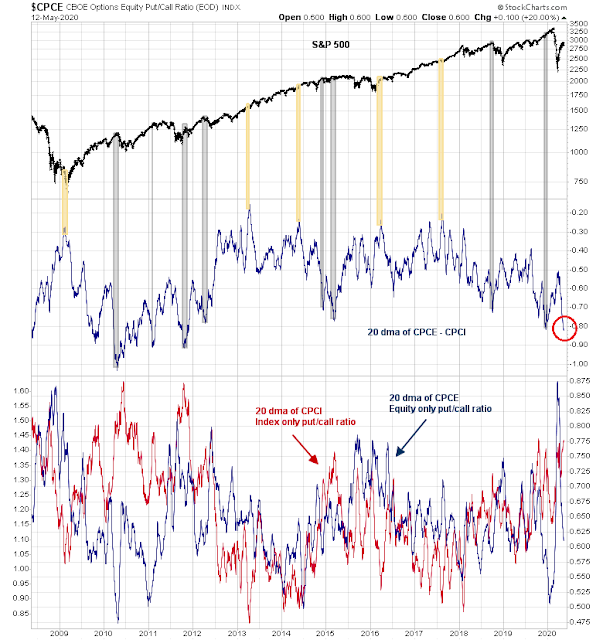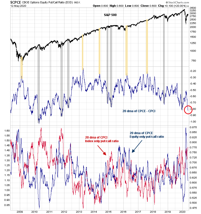 In light of the entrance of new traders, a unusual bifurcation has appeared in the option market. The equity-only put/call ratio, which tends to be the main playground of retail traders, has diverged from the index put/call ratio, which is more used by professional traders and hedgers. In the past, significant gaps between these ratios have been either decent buy signals (in yellow), or high risk signals where the market advance either stalled or fell (in grey). Readings are now at or near a sell signal.