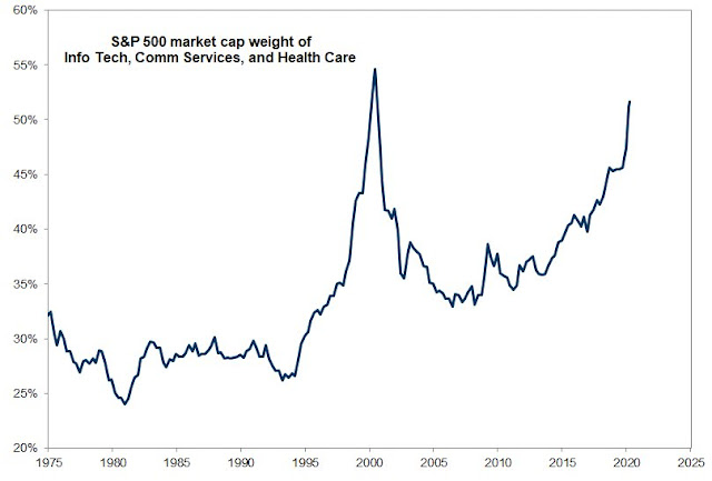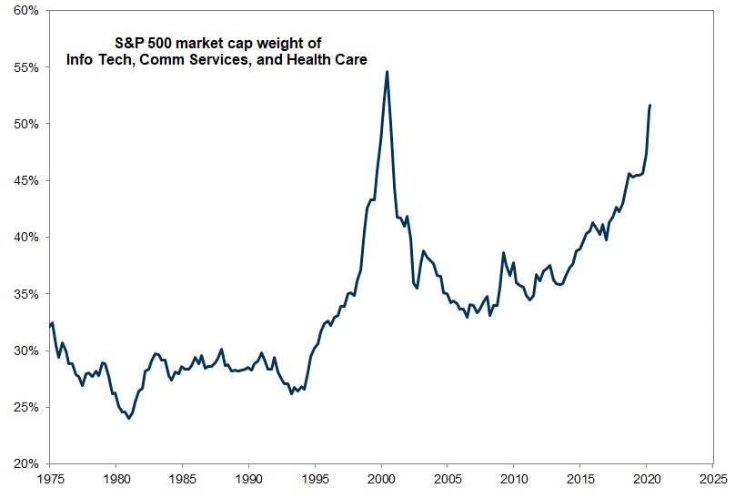 The market’s narrow leadership is evidenced by the concentration of the current leadership of technology, healthcare, and communication services, which is nearing the highs set during the Tech Bubble.