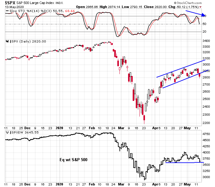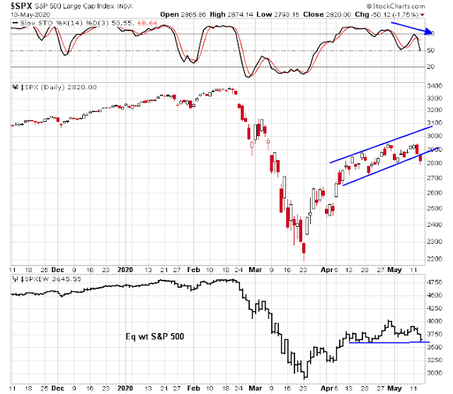 Mid-week market update: Is this market starting a new bear leg? There are numerous signs that may be happening. The SPX violated the trend line of a rising channel while the stochastic recycled from an overbought reading, which is a sell signal. The chart of the equal weighted index, which filters out the effects of heavyweight leadership, looks worse as that index tests a key support level.