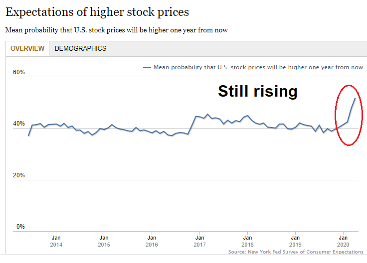 It may be turning out that way. Sentiment signals are flashing contrarian bearish signs. About a month ago, I had highlighted the surprising results of New York Fed’s consumer expectations (see The 4 reasons why the market hasn’t seen its final low). The latest update of the monthly survey shows that expectations of higher stock prices 12 months from now surged even higher.
