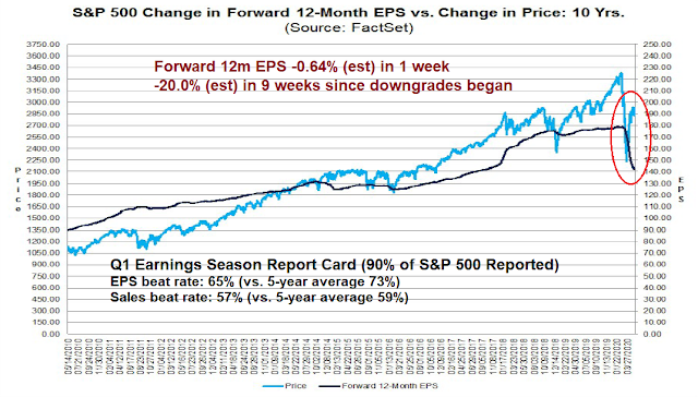 There was more good news, and bad news the FactSet summary of Q1 earnings reports. Let’s start with the good news. The speed of earnings downgrades is decelerating. Forward 12-month EPS fell -0.64% last week, compared to -1.4% the previous week. This is a marked improvement from the experience of the past several weeks, when estimates fell consistently by -1% or more. Estimate revision deceleration can be attributed to the fact that bottom-up EPS estimates are starting to converge to top-down estimates. The 2020 bottom-up consensus estimate of $129.16 is within striking distance of the top-down estimate of $120-$125. However, the bottom-up 2021 estimate of $164.68 is still a little elevated compared to the top-down consensus of $150.