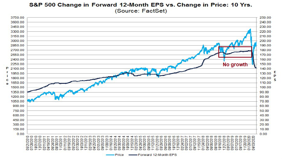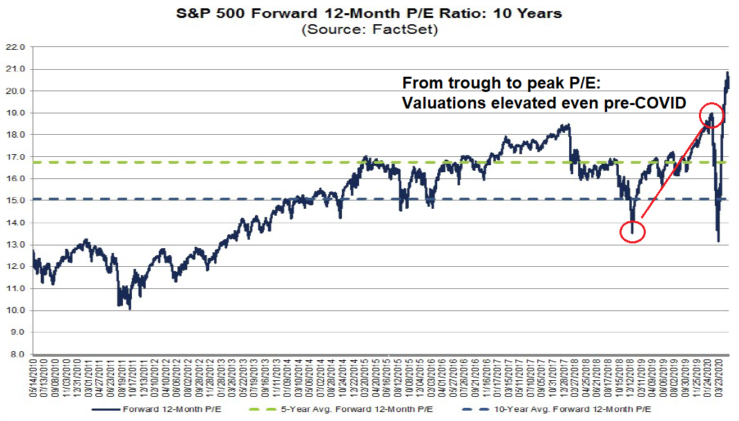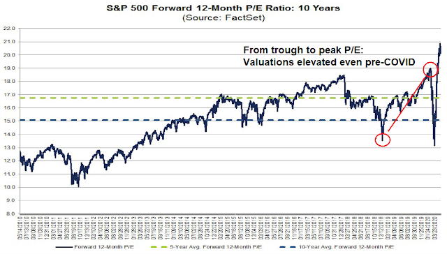 We can see the valuation effects of the advance off the Christmas Eve bottom in 2018. The forward P/E ratio rose steadily, until it peaked at 19 just before the COVID-19 crisis.