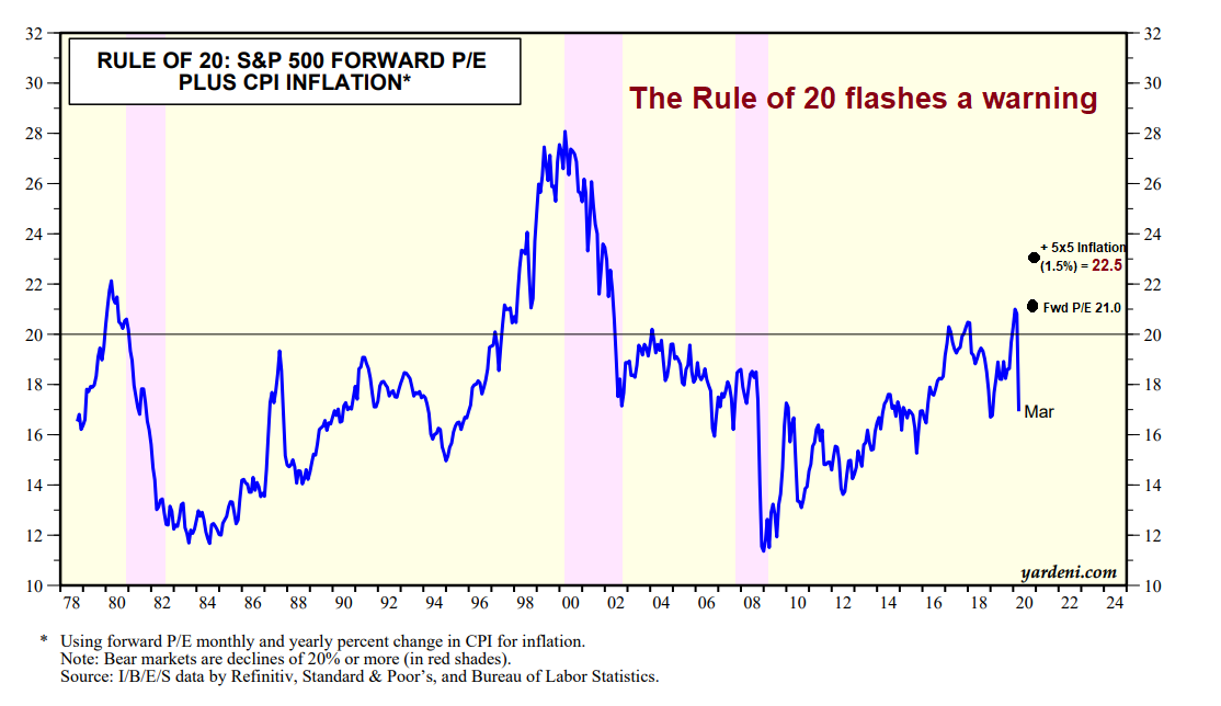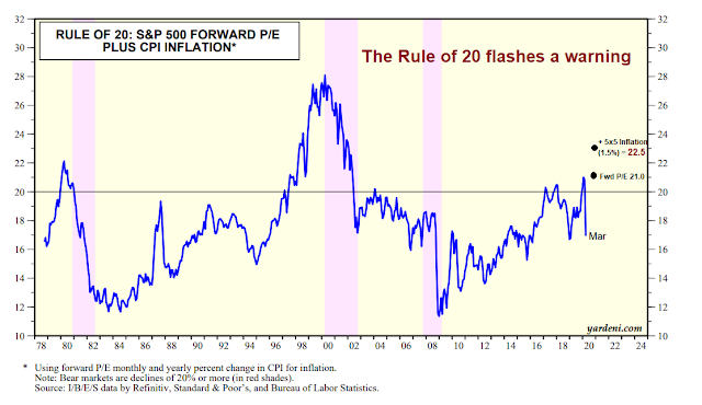 Elevated valuations have sparked Rule of 20 warnings, which flashes a sell whenever the sum of the forward P/E ratio and inflation rate exceeds 20. The market was already overvalued based on the Rule of 20 even before the onset of the pandemic. Stock prices duly retreated as the COVID-19 crisis evolved, but the latest recovery is flashing another Rule of 20 sell signal.