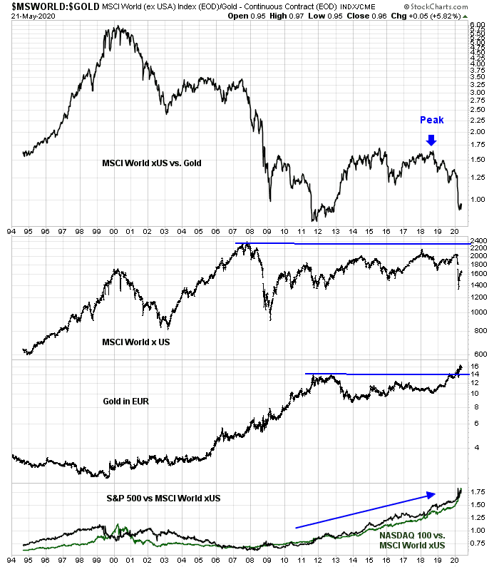 The stock/gold ratio outside the US, as represented by the MSCI World xUS Index, looks even worse. The MSCI World xUS Index never recovered its pre-GFC peak. Gold, as priced in euros, has reached all-time highs. The post-GFC equity market recovery is entirely attributable to the outperformance in the US.