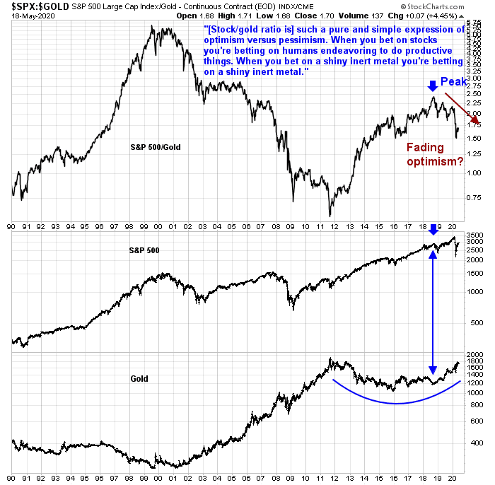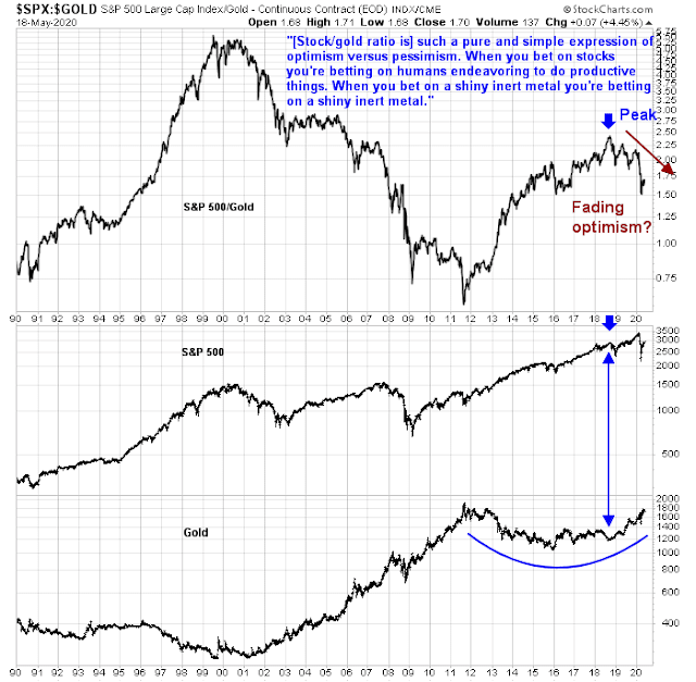 While the human development is falling this year, the market’s perceived decline of confidence did not begin with the COVID-19 pandemic. Last week, I highlighted a comment by Joe Wiesenthal at Bloomberg when he focused on the stock/gold ratio as a barometer of optimism and pessimism (see Checking the small business economic barometer). I would go further to characterize the ratio as a barometer of investment confidence in human ingenuity.
